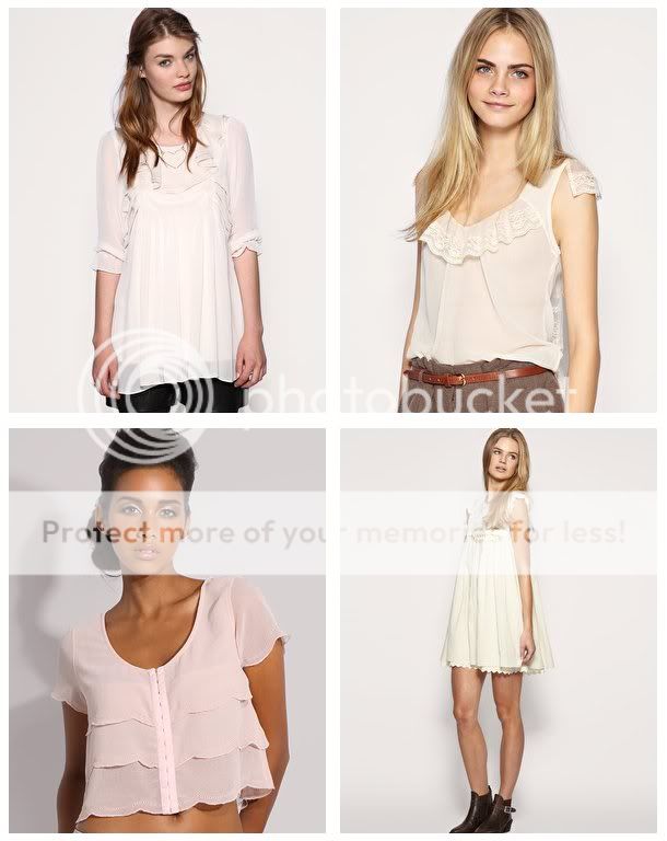 source: asos - cute collar trim drop smock dress, ruffle front cropped blouse, pussybow blouse, dress in rose print, blush dress with pleat detail and frill collar, lace tiered back top, cropped scallop edge blouse, darling lace cotton smock dress.